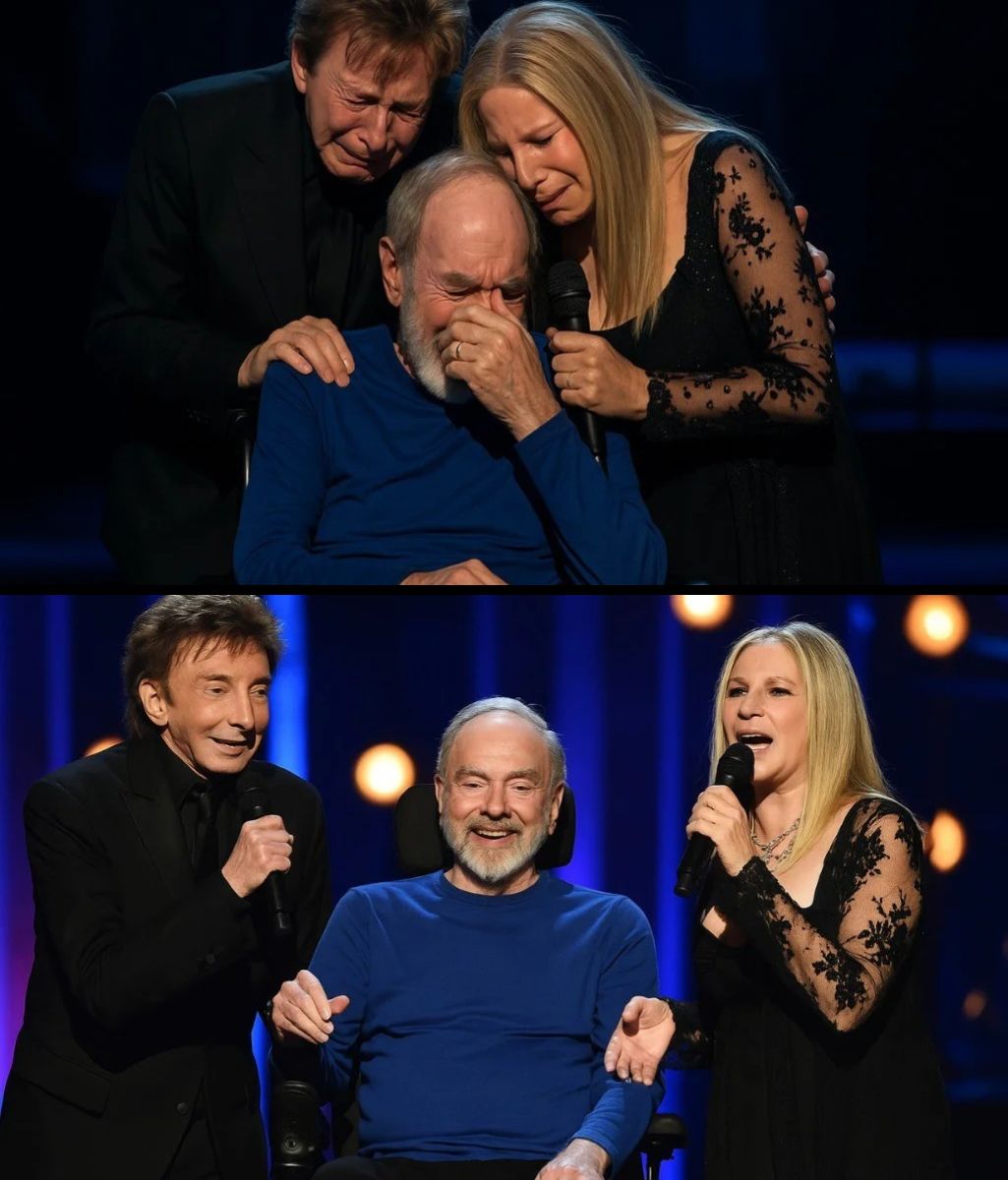 At his side stood Barbra Streisand, elegant and steady, her eyes filled with the kind of affection that only decades of shared history can hold. Behind the piano waited Barry Manilow, hands poised above the keys, his face marked by the solemn awareness that this was not a concert — it was a moment that would be remembered for generations.