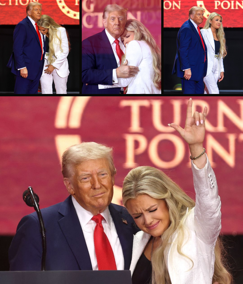 As the crowd remained hushed, former President Donald J. Trump stepped forward. Known for his commanding presence, he moved not toward the podium or the cameras, but directly toward Erika Kirk, the grieving widow who had stood with remarkable courage throughout the service. Erika, her face streaked with tears, rose to meet him. What followed was not a speech, not a headline crafted in advance, but a simple human embrace — one that seemed to still the entire stadium.