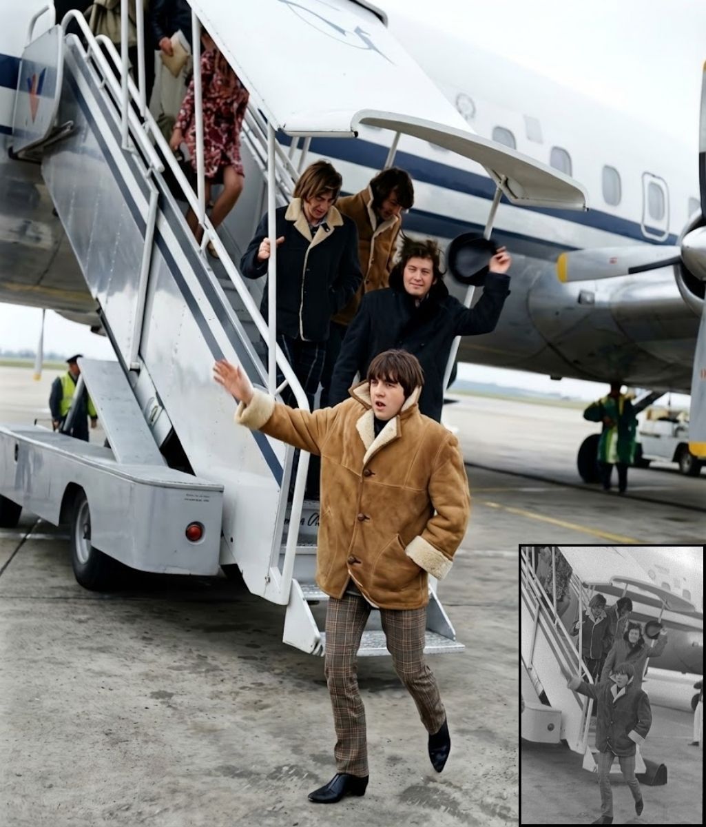 Now, after decades buried in forgotten film reels and private archives, a new collection of never-before-seen photographs has surfaced — capturing that arrival with spine-tingling intimacy. The images reveal not the bubblegum glamour often associated with The Monkees, but something far more haunting: four young men, wide-eyed and solemn, descending the stairs of a private plane into a moment that would quietly brand itself onto the soul of rock history.