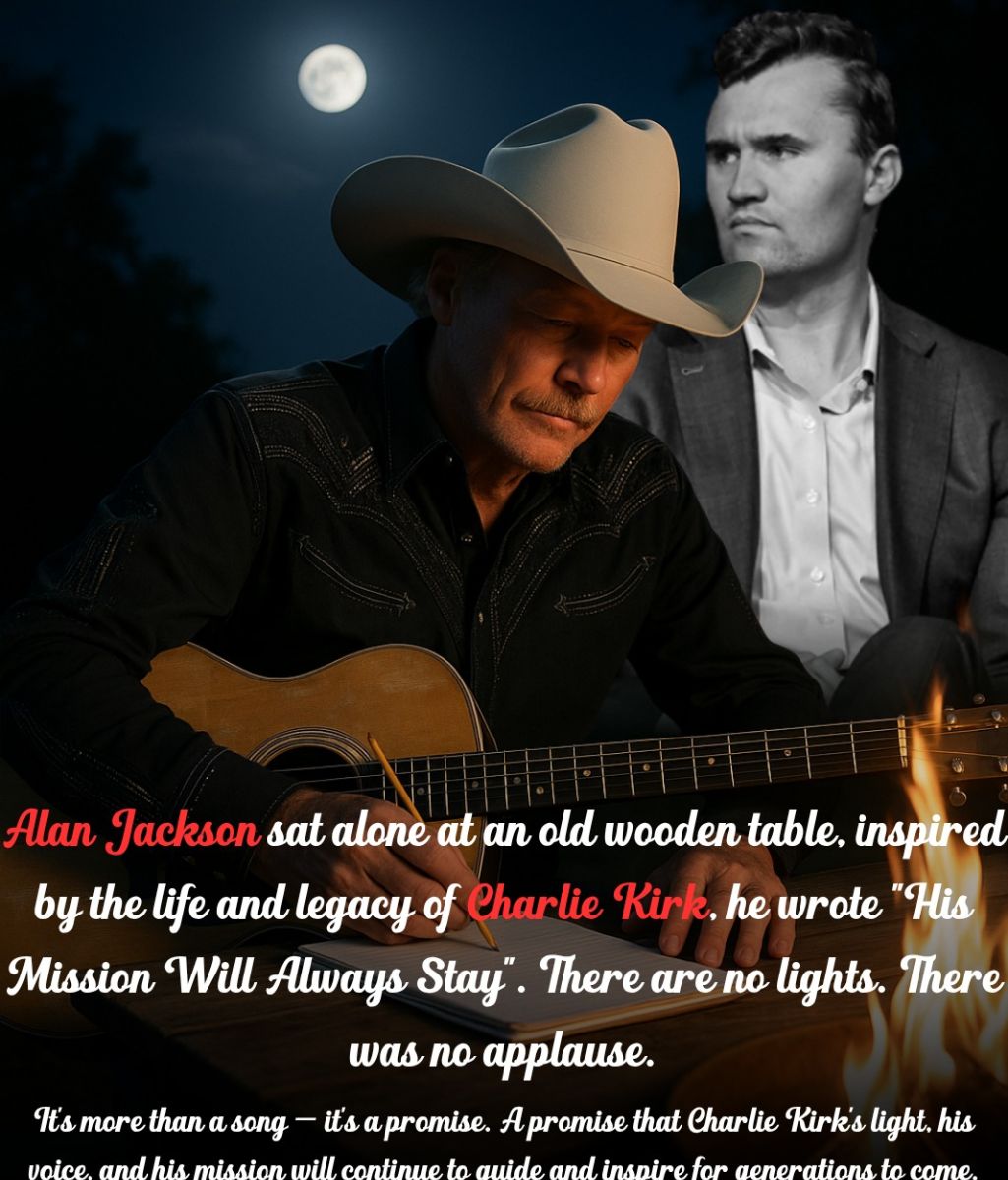 Just now in Nashville, Tennessee, country legend Alan Jackson, at 67 years old, has once again reminded the world why his music carries such timeless emotional weight. In the quiet of his home — no cameras, no spotlight, just the soft creak of an old wooden chair — he sat down at his worn desk and began to write. The result was a brand-new song titled “His Mission Will Always Stay,” a powerful tribute inspired by the life and enduring legacy of Charlie Kirk.