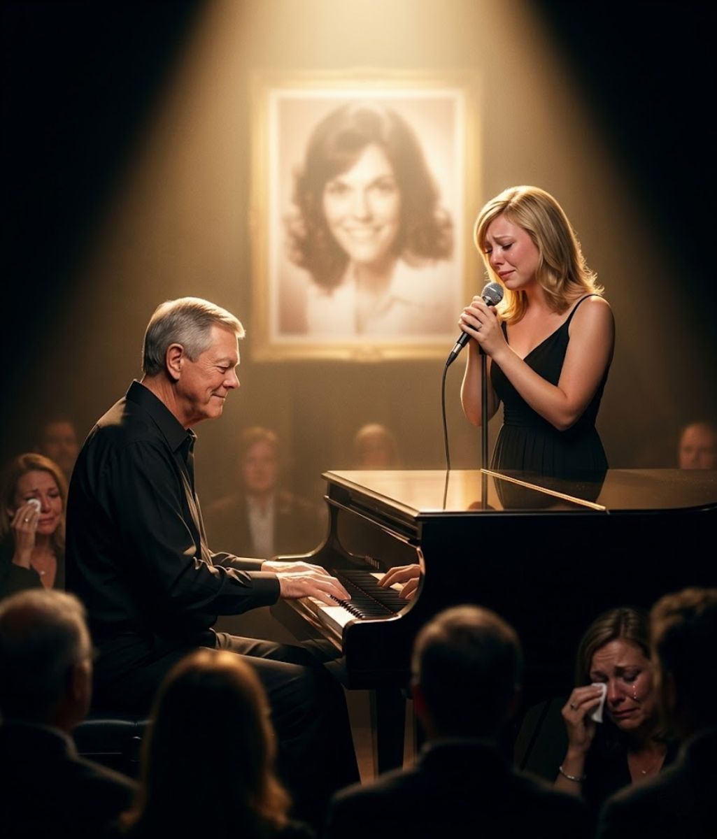 No one in the hushed audience that evening could have possibly anticipated the profound emotional journey that was about to unfold before their eyes. The room, already filled with a quiet sense of reverence and anticipation, grew even more still as Richard Carpenter made his way slowly onto the softly illuminated stage. He walked with the gentle dignity of someone carrying decades of cherished memories, positioning himself beside Mindi under the warm embrace of a single golden spotlight. In that sacred space, only a beautifully polished piano stood ready, accompanied by a luminous photograph of Karen Carpenter glowing softly in the background like a beacon from the past. The atmosphere itself seemed to pause, as if the very air held its breath in respectful silence, waiting for what would come next.