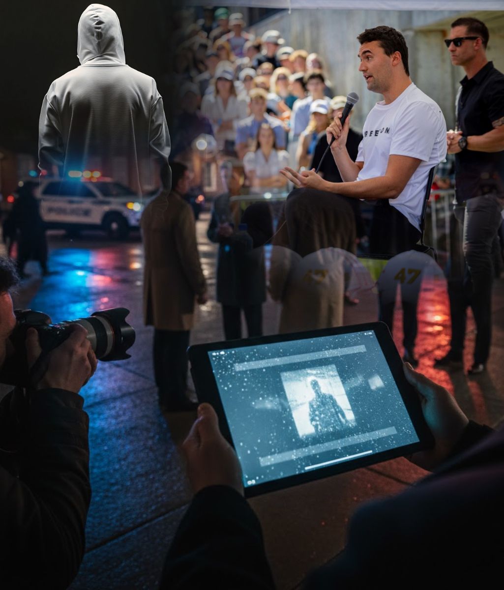 In the video, the camera shakes as the crowd gathers around the rally site in Washington, D.C. Charlie Kirk, visible on a nearby stage, had just finished addressing the audience when chaos suddenly erupted. A single shot echoes through the noise, followed by screams. Amid the confusion, the camera briefly catches the figure of a man fleeing toward a parked vehicle — his face illuminated just long enough to be unmistakably recognized.