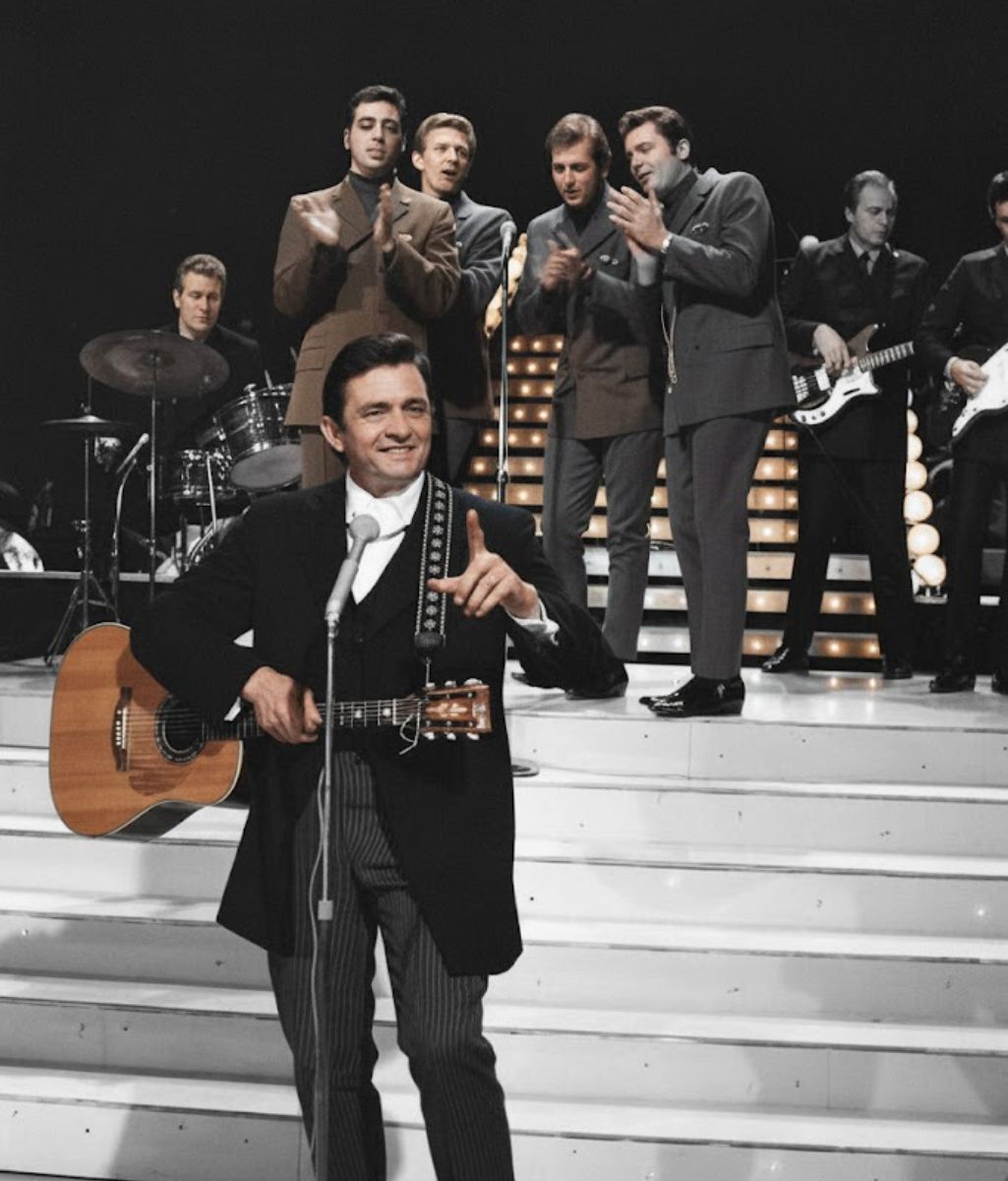The setlist moved with the ease of a man who knew exactly who he was and what his music meant. “I Walk the Line” rolled out steady and true, each word carrying the weight of lived experience. “Folsom Prison Blues” sent a jolt through the crowd, its train-track rhythm shaking the floorboards. And when June Carter stepped forward to join him, laughter blossomed across the stage, filling the hall with a warmth that only two people who truly understood each other could share.