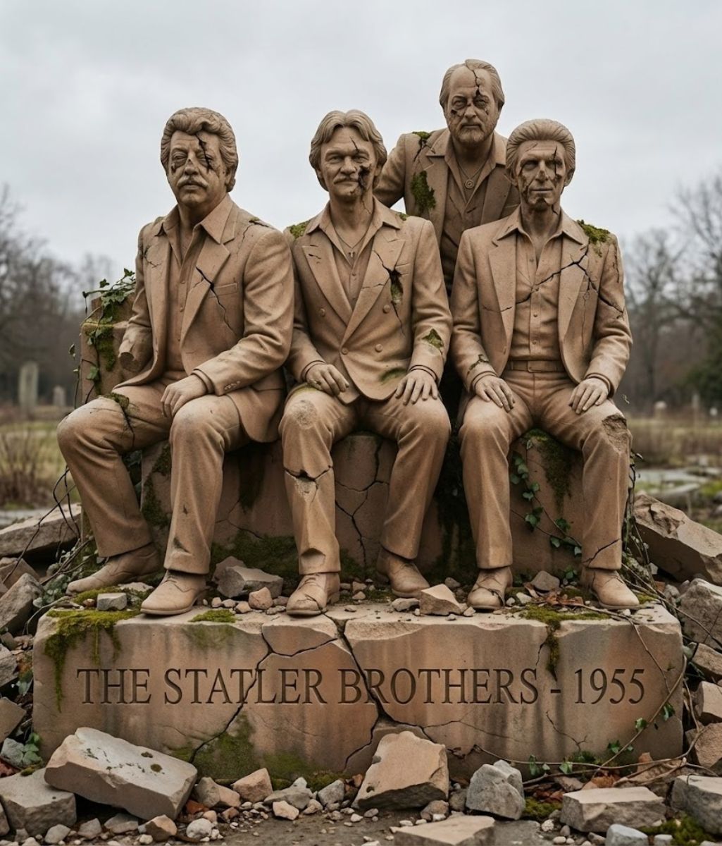 The tribute statue honoring The Statler Brothers — the legendary quartet from Staunton, Virginia, whose songs defined a generation — has been partially destroyed in what fans are calling an unthinkable violation. Reports confirm that the structure, long considered a symbol of faith, brotherhood, and musical purity, was severely damaged in the early hours of the morning. Chunks of its base were shattered, part of the engraved plaque torn clean off, and crude markings left behind in what police now believe was a premeditated attack.