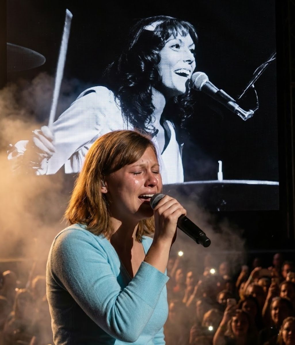 When Mindi walked on stage—silent, solemn, dressed in pale blue like Karen once wore on tour in 1975—there was an eerie calm in the auditorium. The lights dimmed. A single piano note rang out. And then, a voice so achingly familiar it made people gasp.