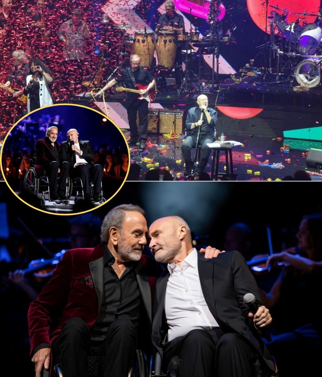 The lights dimmed. The orchestra fell silent. And from opposite sides of the stage, two wheelchairs emerged from the shadows, each carrying a legend — Phil Collins and Neil Diamond.