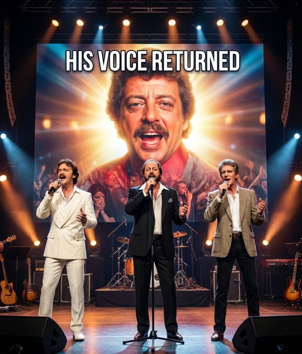 From hidden speakers around the arena, a lost vocal tape began to play — a recording no one outside the family had ever heard before. Harold Reid’s voice, lifted from a private 1990s session long thought misplaced, roared to life like a ghost wrapped in velvet.